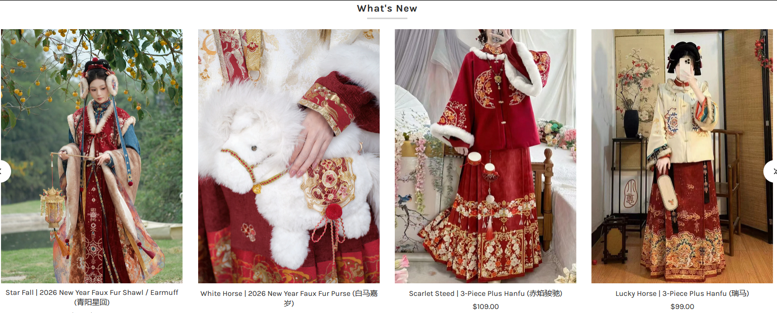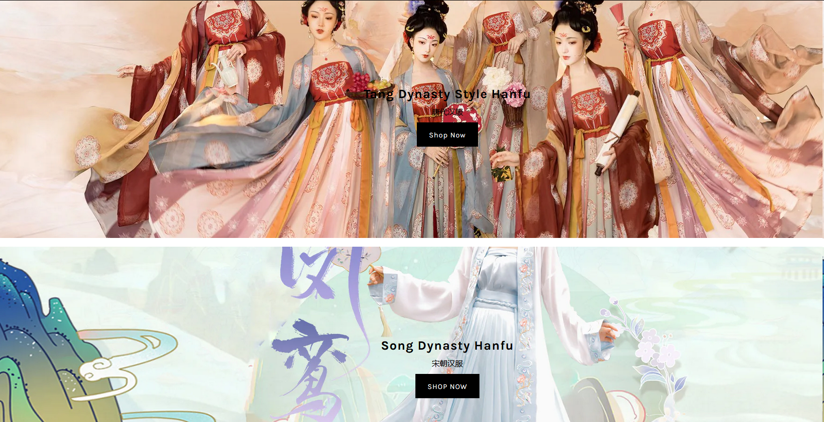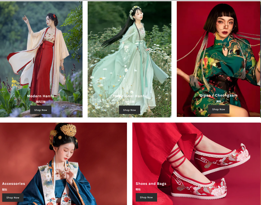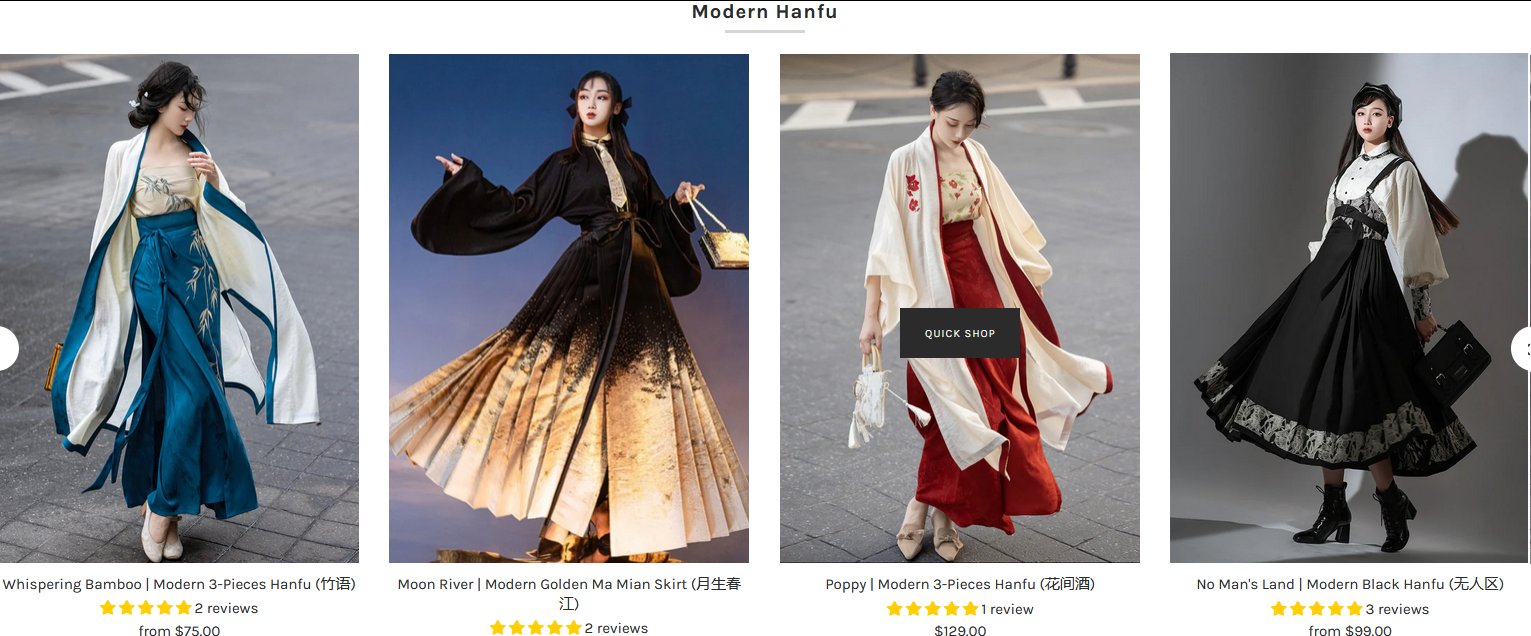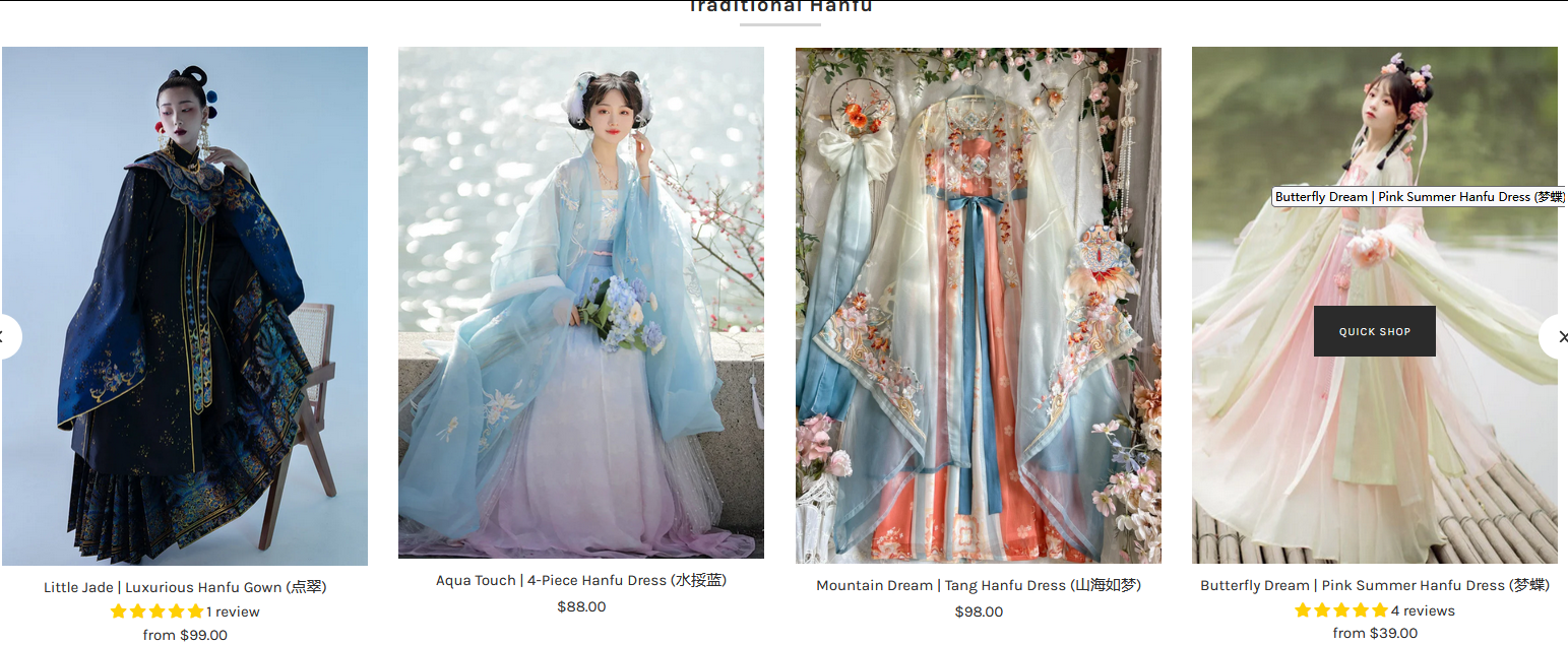 在独立站的产品栏这里,上架了多款汉服产品,精美的图片让浏览独立站的访客怦然心动。不同风格、尺寸、材质和颜色。 其次,为客户提供了丰富的汉服选择,有不同朝代的汉服服饰,无论客户喜欢古风的诗酒田园,还是钟爱传统的叠雅礼仪,他们都可以满足客富的需求,同时可以为客户量身定制,提供专业的定制服务,让客户拥有独一无二的汉服。